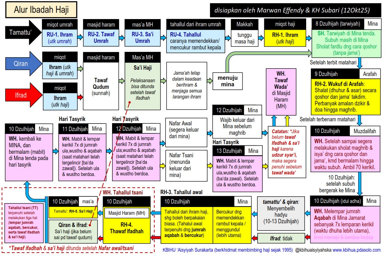 Berdasarkan tata cara pelaksanaan ibadah haji, ada tiga macam cara untuk mengerjakannya, 1) Haji Tamattu’, 2) Haji Qiran, dan 3) Haji Ifrad. Ketiganya tergambar pada alur skema haji.