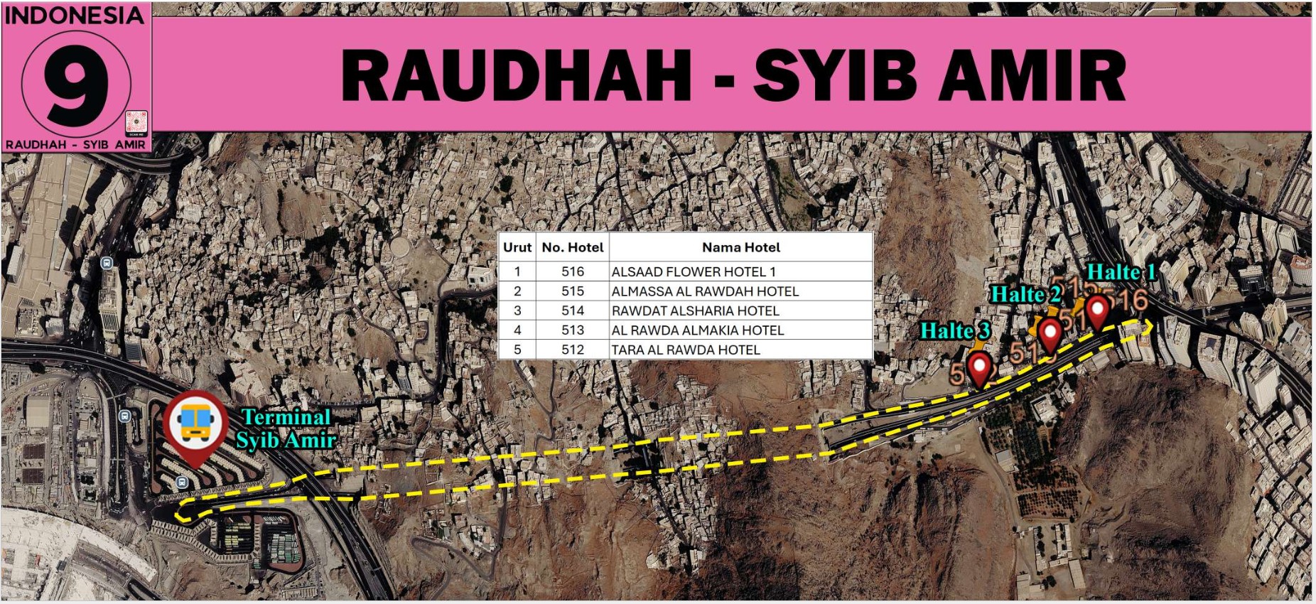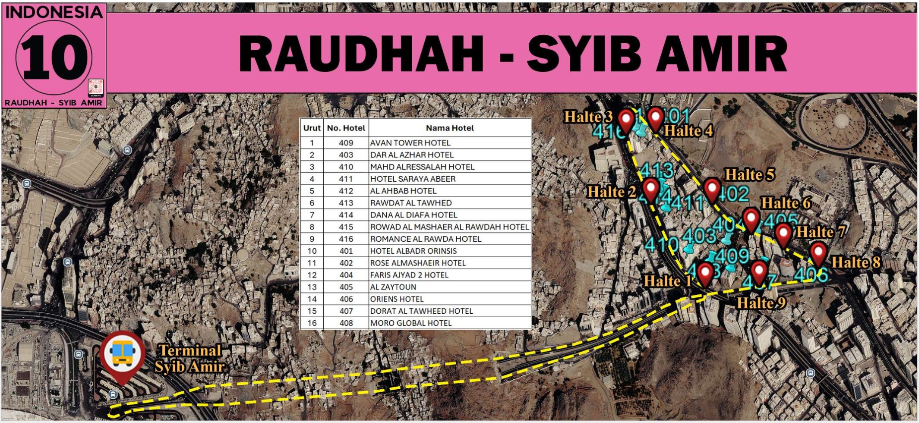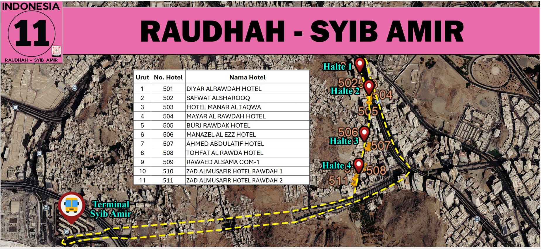 Pada musim haji tahun 1447H / 2026M, bus shalawat yang melayani jamaah haji Indonesia di Makkah, Rute dari Kawasan Hotel di Raudhah – terminal bis Syib Amir