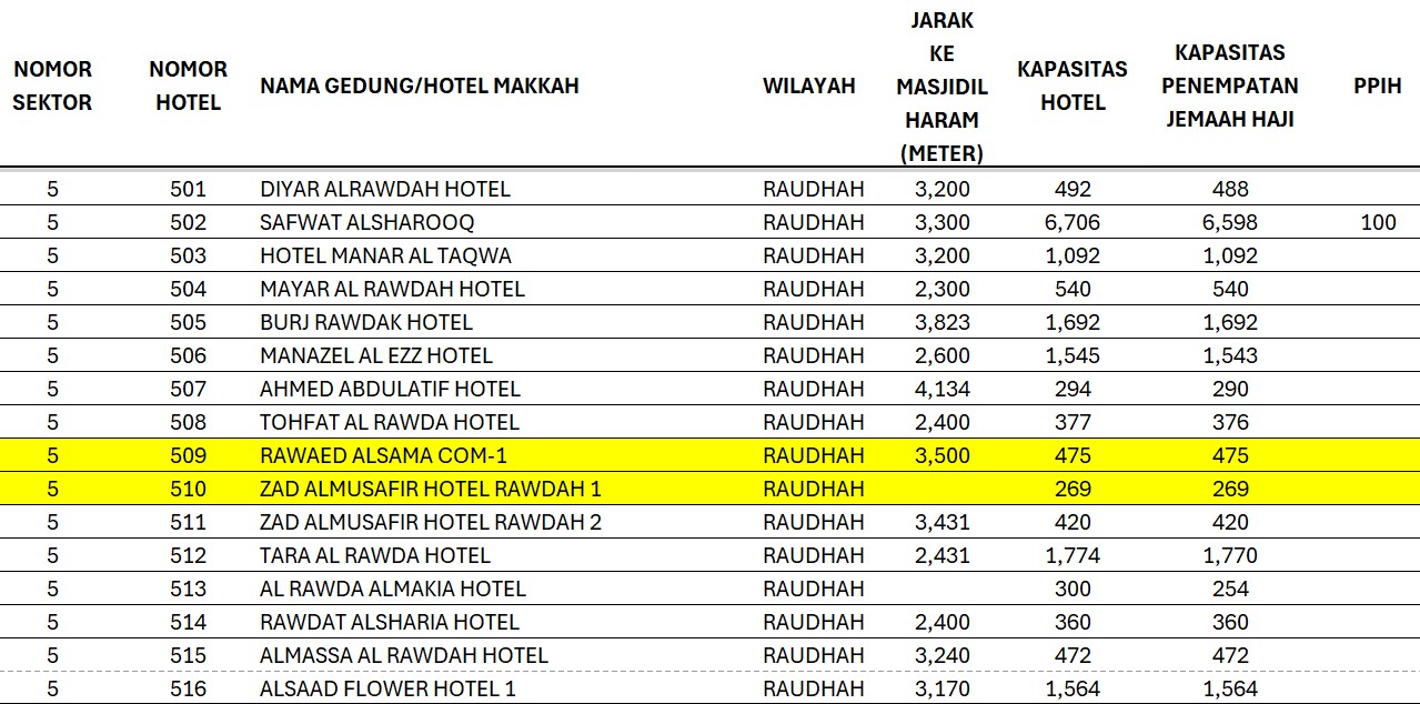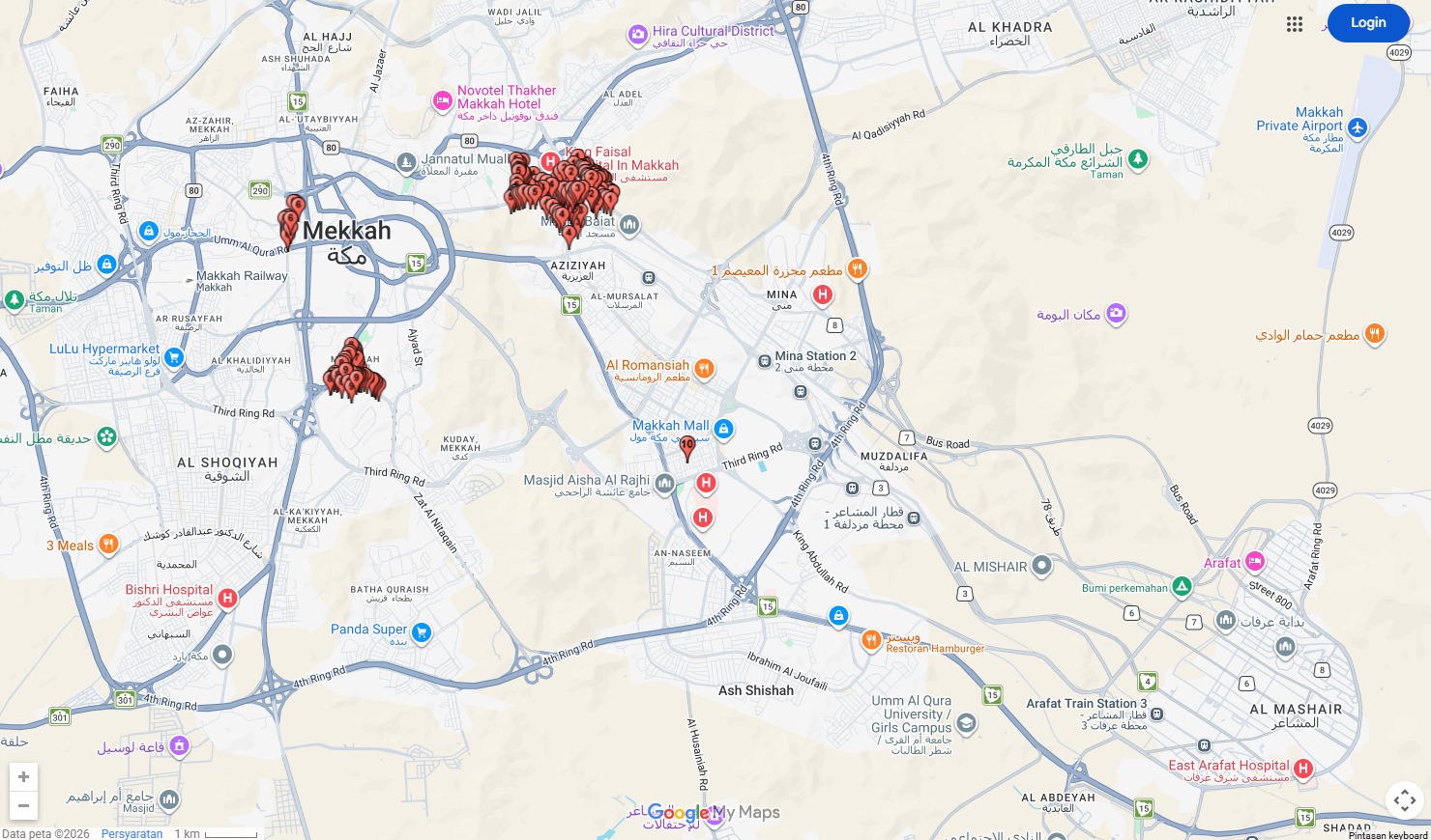 Posisi masjid al-haram, pemondokan (hotel), Mina, Muzdalifah, dan Arafah