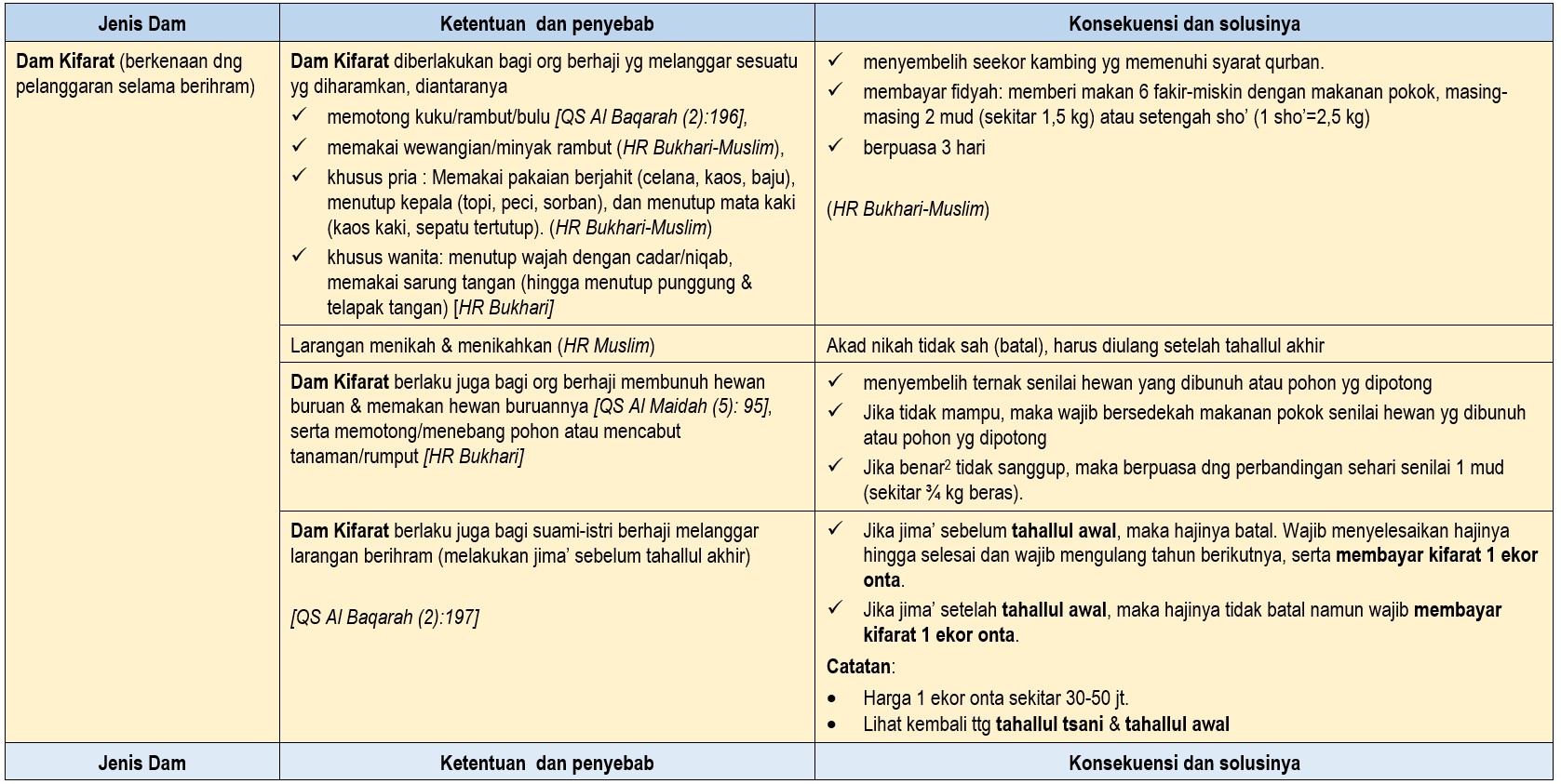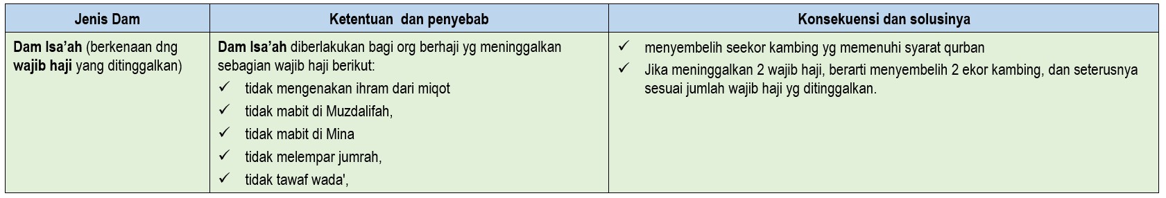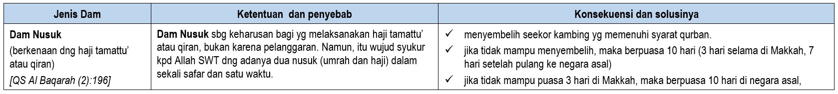Berdasarkan kategori dam, ada  tiga (macam) jenis dam, yaitu 1) dam nusuk, 2) dam isa’ah, dan 3) dam kifarat.