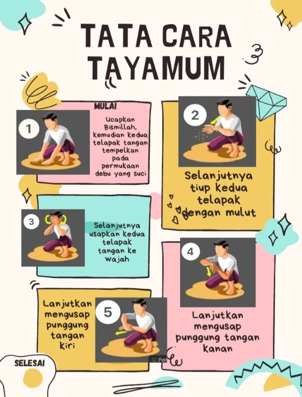 2) Menepuk kedua telapak tangan ke tanah atau tempat yang berdebu atau media apa pun yang suci & terjangkau (kursi atau jendela pesawat terbang), kemudian meniup keduanya, satu kali.