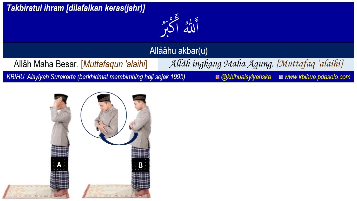 Setelah berwudlu dan berniat ibadah shalat secara Ikhlas karena Allah SWT, kita berdiri menghadap kiblat dengan pandangan ke arah tempat sujud dan mengangkat kedua belah tangannya sambil melafalkan Allahu Akbar (takbiratul-ihram) secara keras (jahr). Langkah 1 diilustrasikan dengan posisi A.
