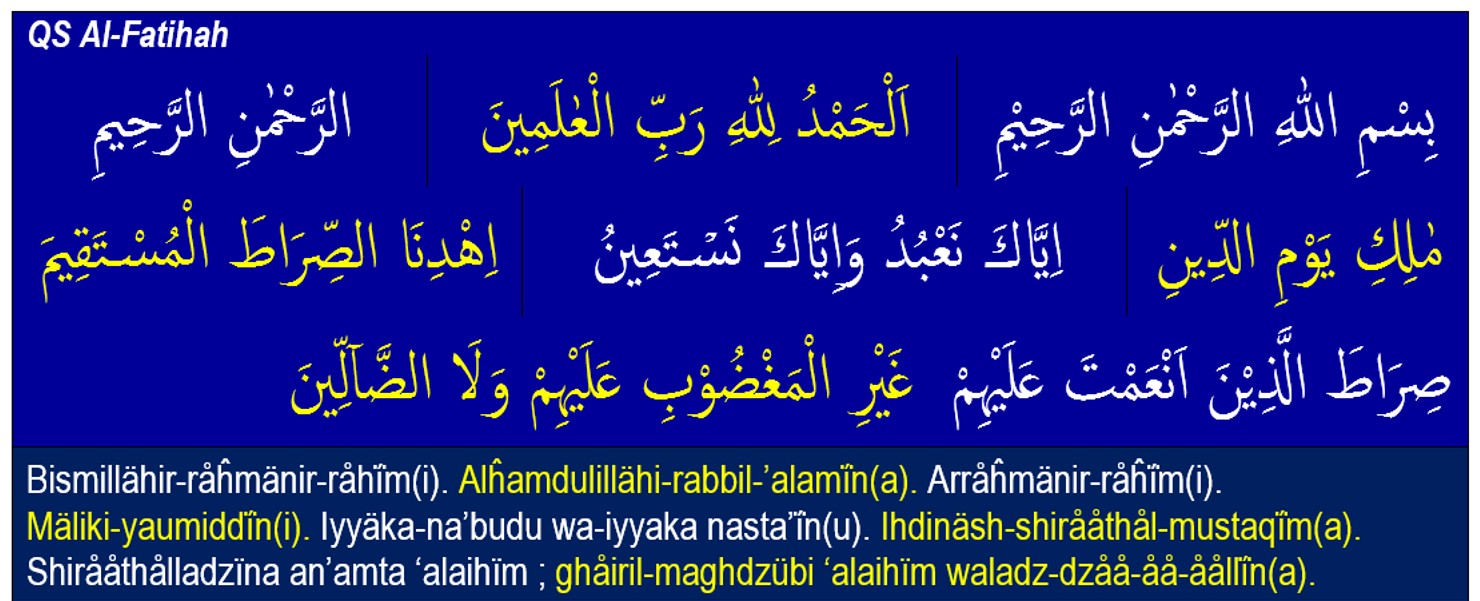 Bacaan Al-Fatihah merupakan satu rukun dalam shalat, sehingga tidak sah tanpa membacanya. Rosulullah SAW membaca surat Al-Fatihah dan lainnya dengan menggerakkan lisannya, bukan hanya dalam hati. Nabi SAW melafalkan ayat demi ayat dan tidak disambung. Imam dan makmum melafalkan aamiin begitu selesai al-Fatihah, yang memberikan makna permohonan terkabulnya doa