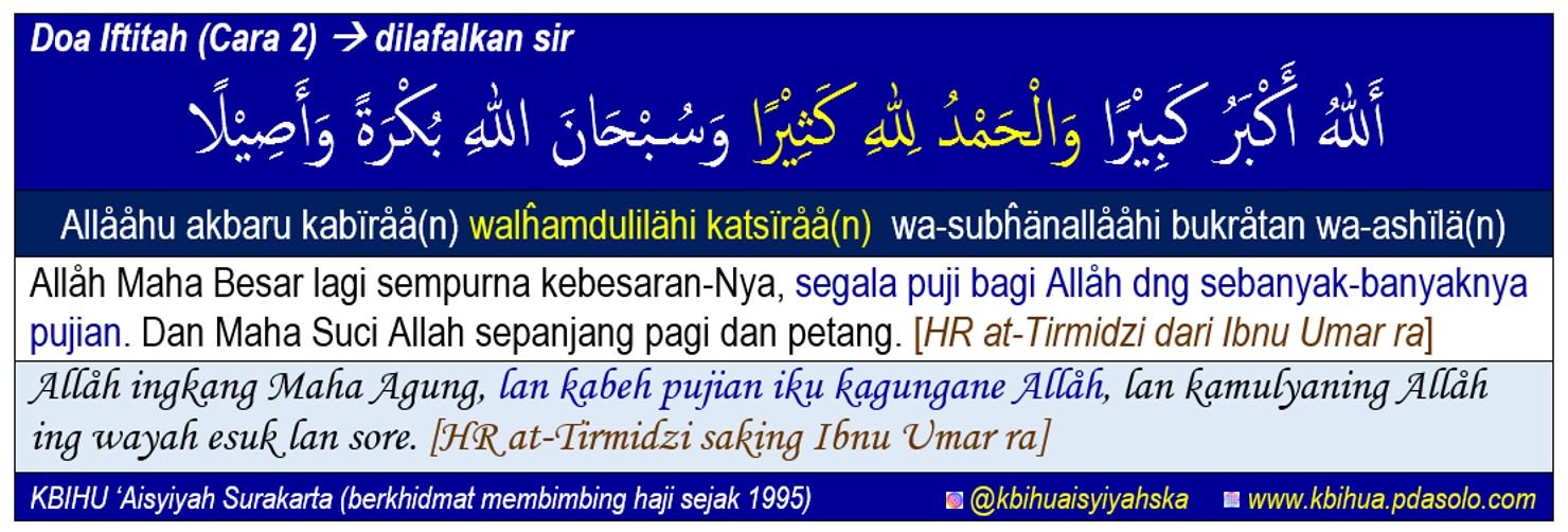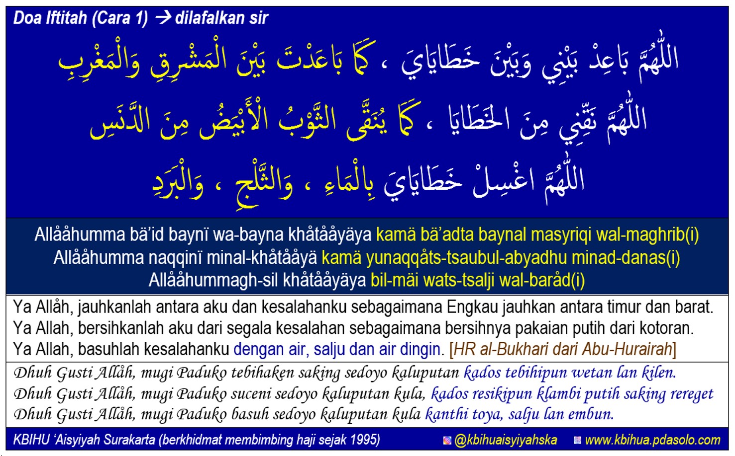 Ada beberapa doa iftitah yang pernah dikerjakan Rosulullah SAW, diantaranya Allahumma baid; Wajjahtu atau Allahu akbar kabira yang doanya sebagai berikut: