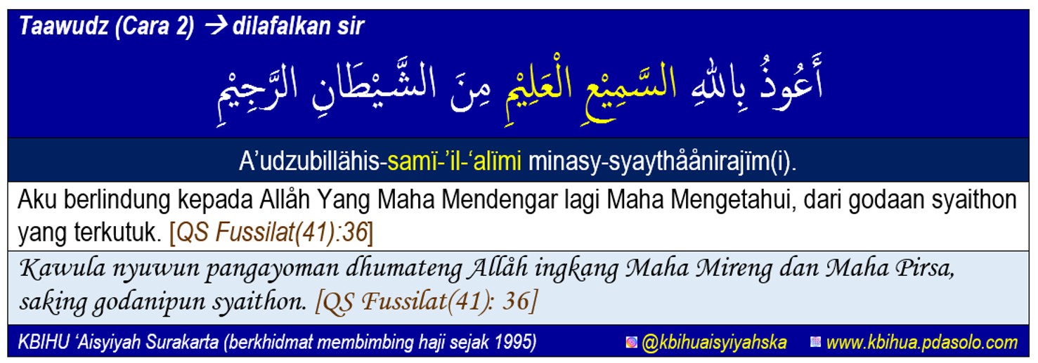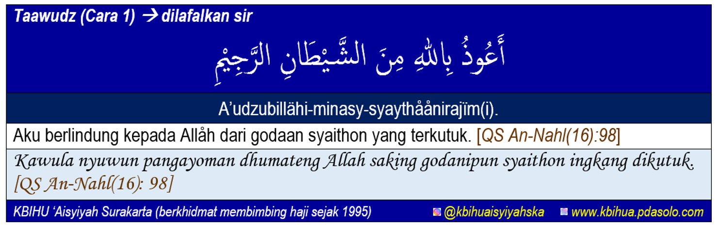 Bacaan ta'awudz merupakan ucapan mohon perlindungan kepada Allah SWT dari segala kejahatan makhluk. Rosulullah SAW membaca taawudz sebelum basmallah dalam shalat di setiap rakaatnya