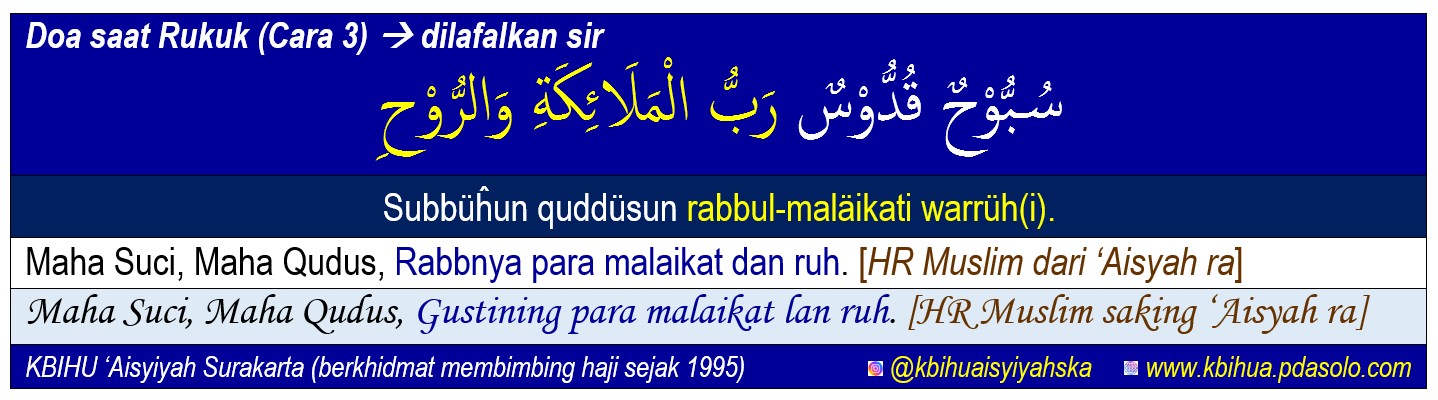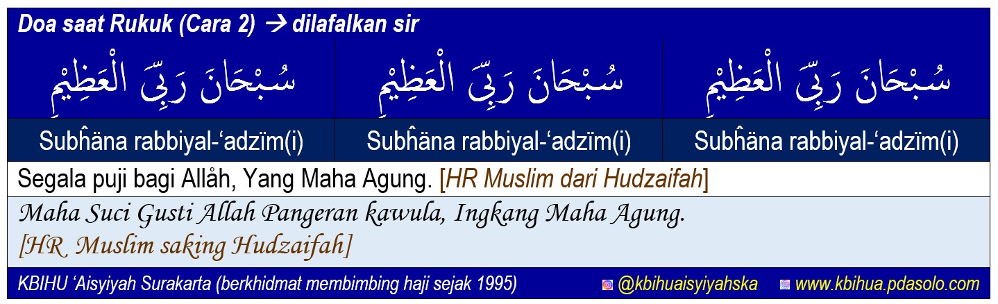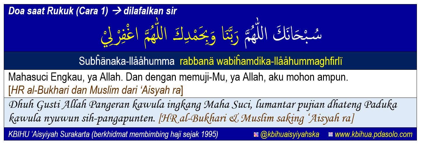 Setelah menyelesaikan bacaan ayat atau surat dari Al Qur’an, selanjutnya mengangkat kedua tangan seperti saat takbiratul-ihram sambil bertakbir (posisi A), dan kemudian rukuk (posisi C). Saat rukuk, jari-jari tangan direnggangkan sambil memegang lutut seraya berdoa rukuk.