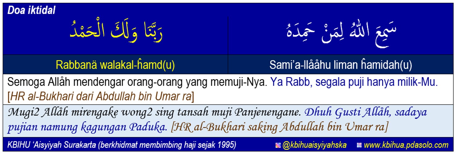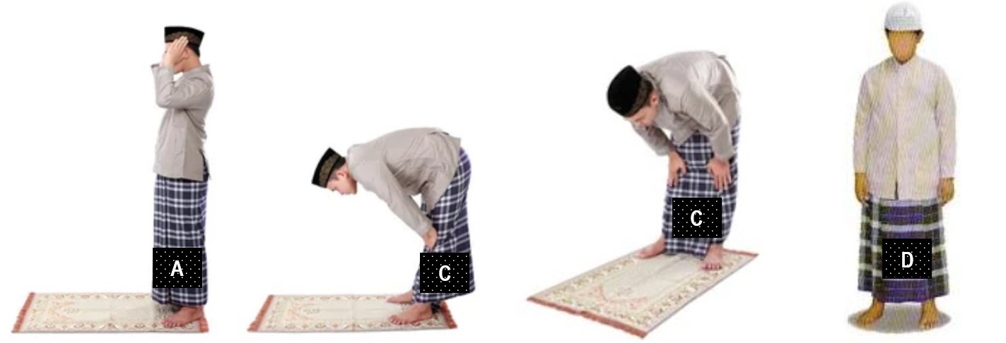 Usai rukuk, kita bangkit untuk berdiri dengan mengangkat tangan (posisi A) sambil mengucapkan sami-‘allahu-liman hamidah, kemudian melepaskan kedua tangan untuk mengambil berdiri iktidal sembari berdoa robbana walakal hamdu (posisi D)