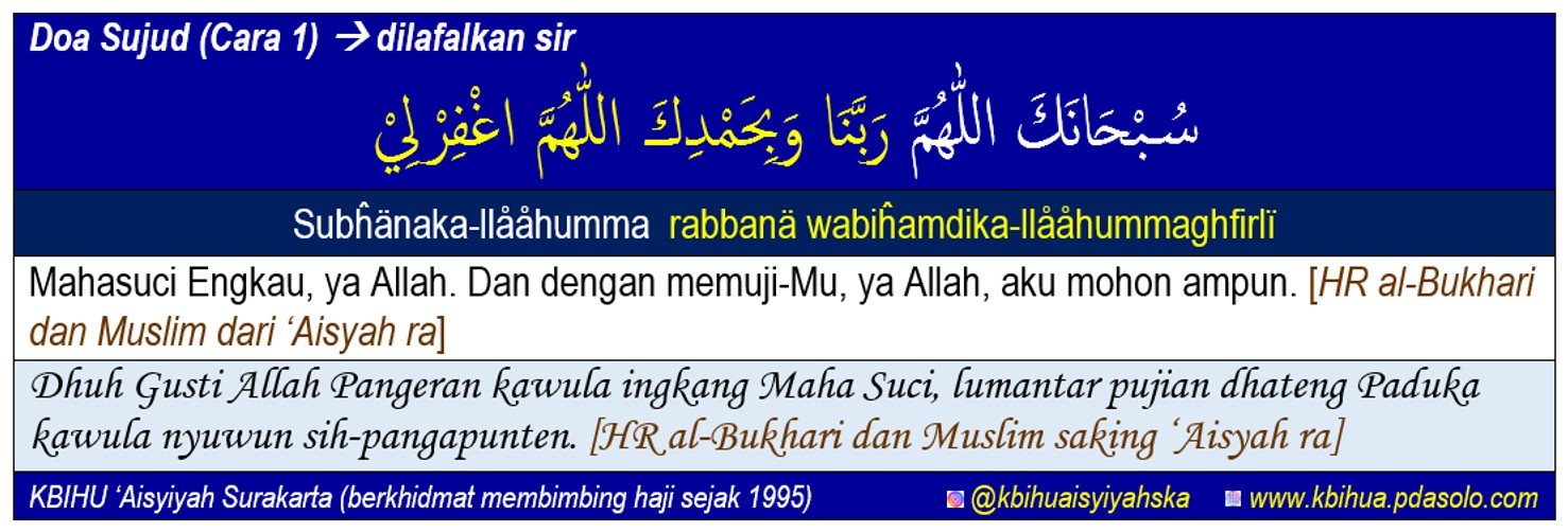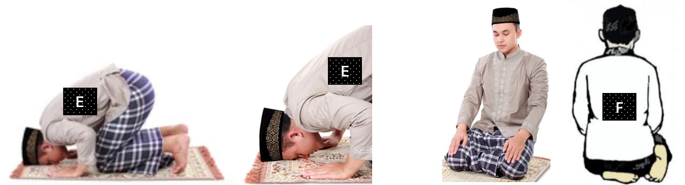 Selanjutnya takbir dan bergerak mengambil posisi sujud (posisi E). Rosulullah SAW menempelkan ketujuh tulang ketika sujud, yaitu kening (dahi-hidung), dua telapak tangan, dua lutut, dan dua ujung kaki. Posisi kedua tangan direnggangkan dari lambung. Doa yang dilafalkan Ketika sujud di antaranya